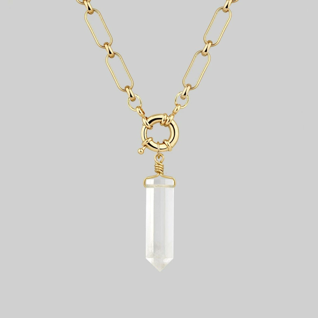 A large natural Clear Quartz gemstone hangs from an oversized Spring ring clasp on a lavish chunky and elegant chain.