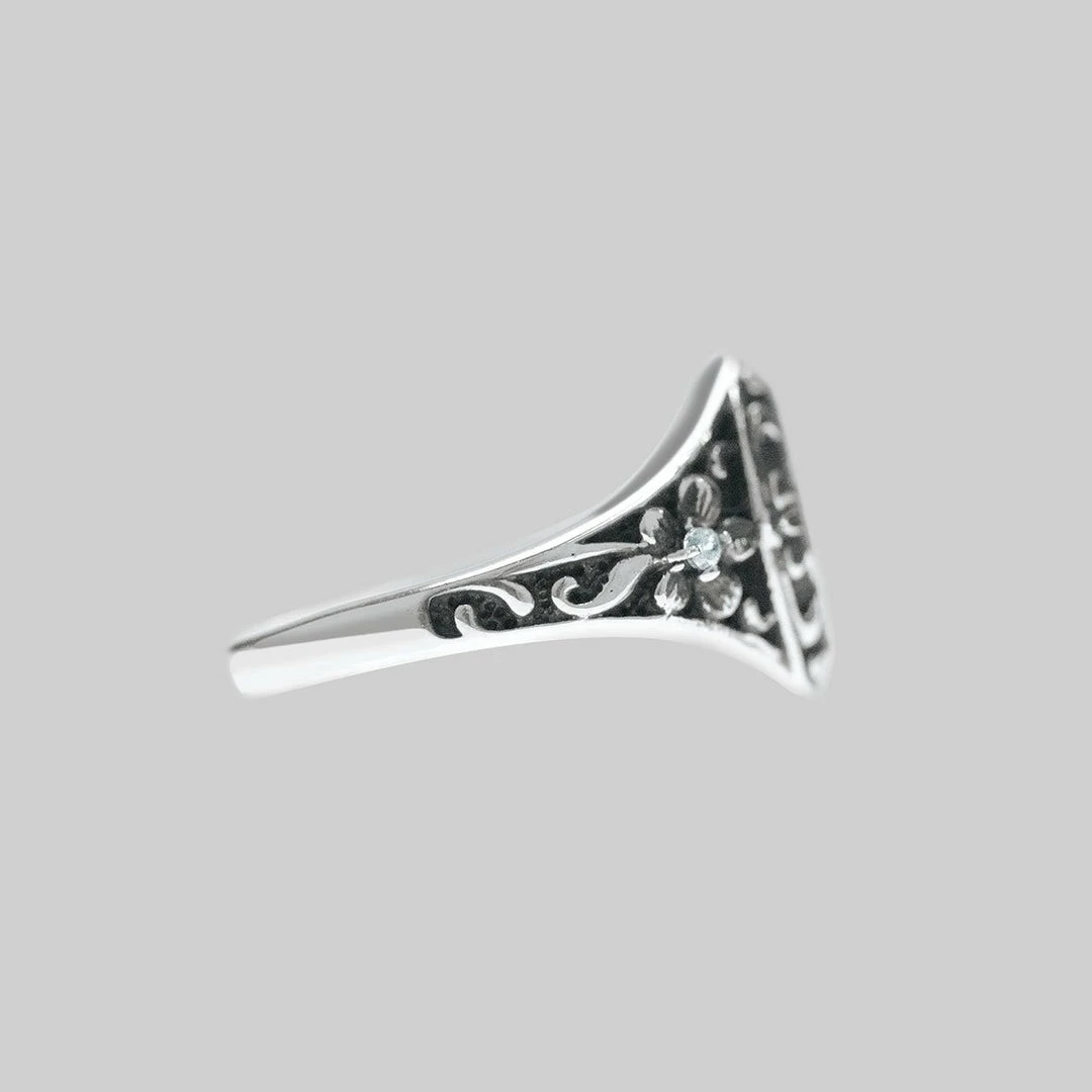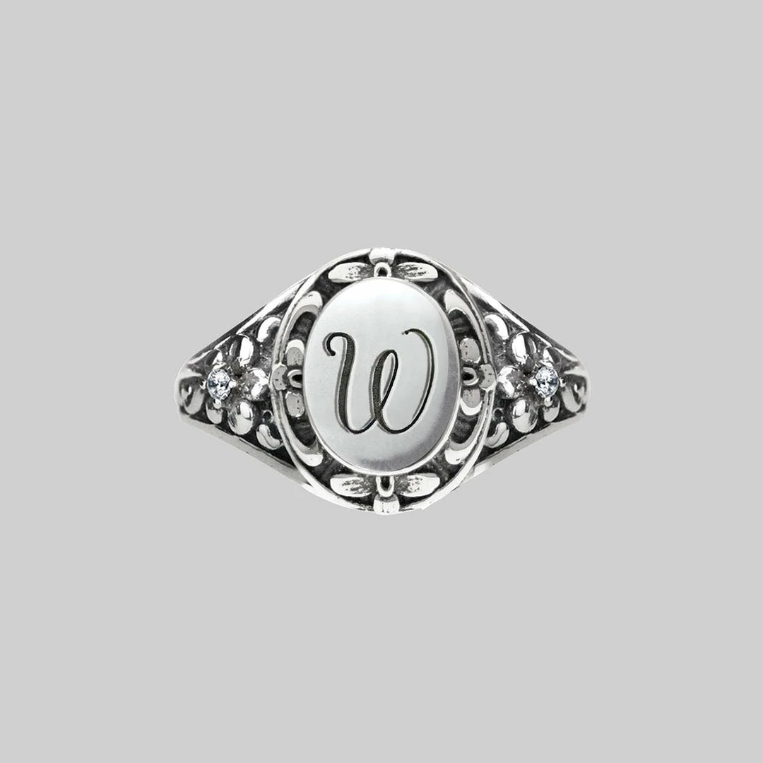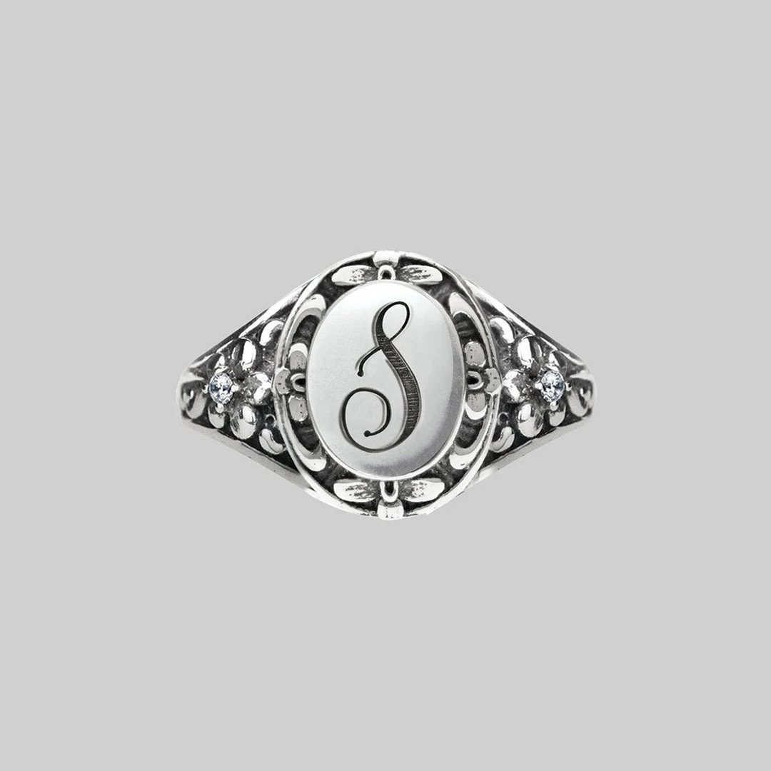 Ornate framed initial ring from Letters A – M featuring two tiny Cubic Zirconia crystals encrusted within dark intricate detailing.
