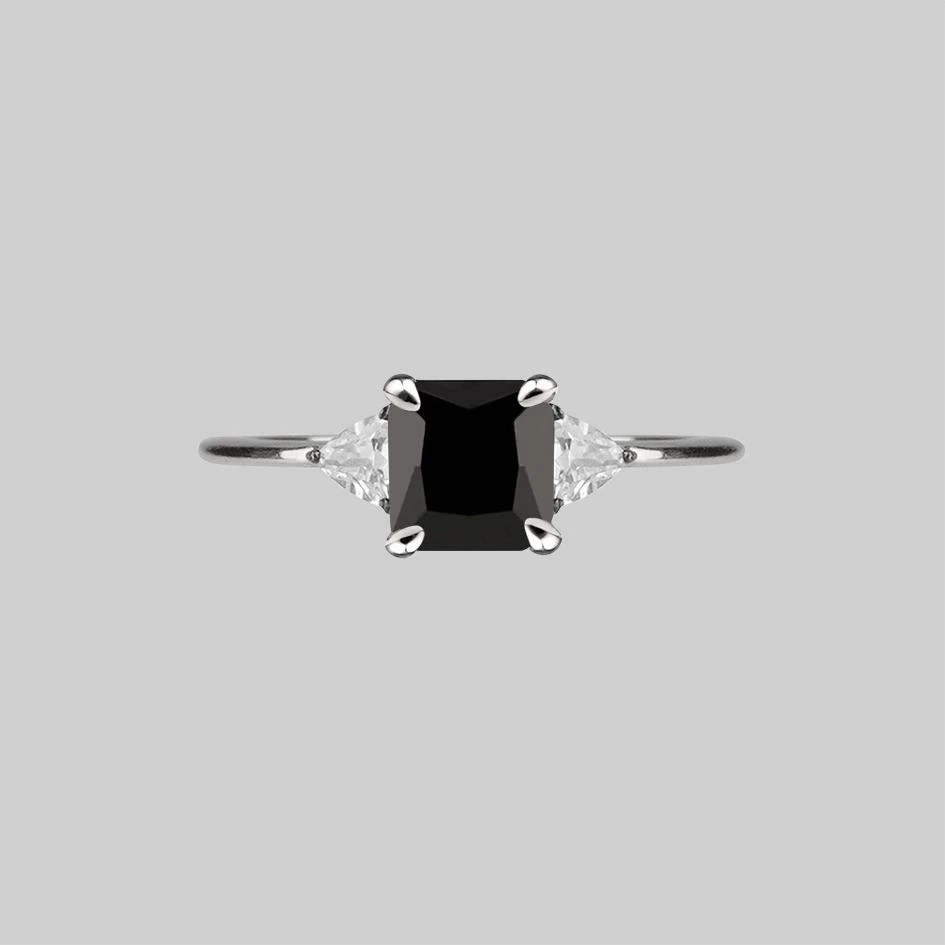 An elegant classic vintage style ring featuring a jet black square-cut Black Spinel with two triangle Cubic Zirconia crystals.