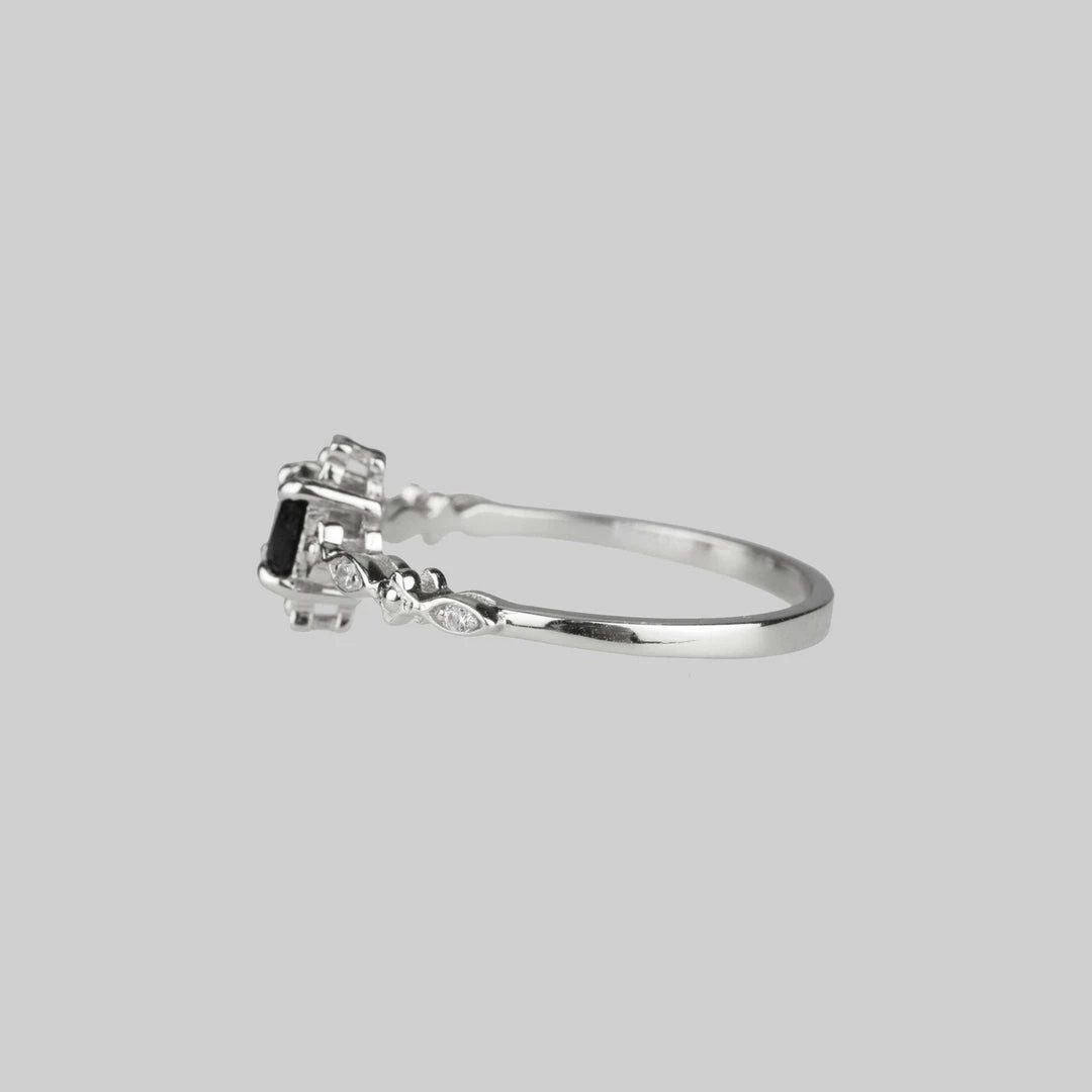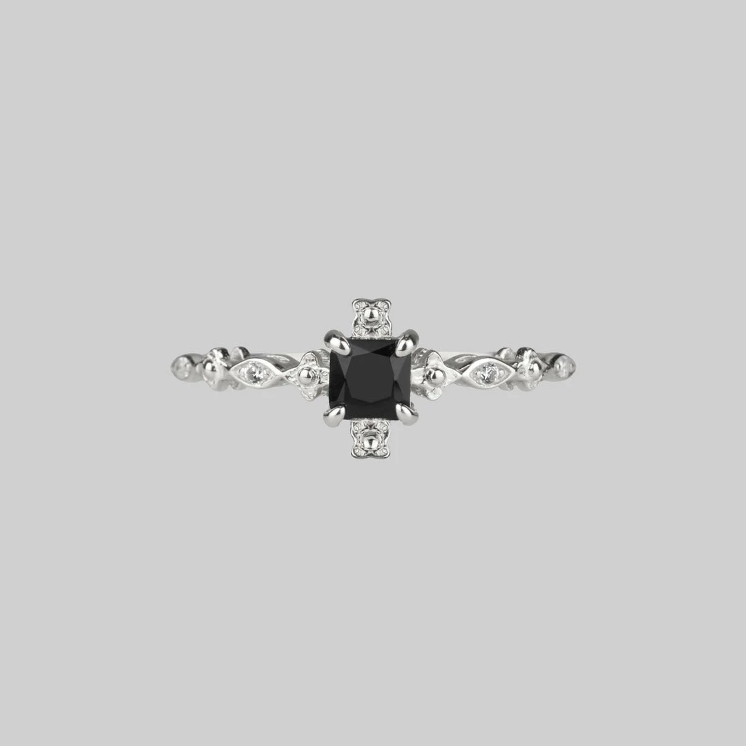Ornate detailed band set with Cubic Zirconia crystal holds a central square cut Black Spinel gemstone.