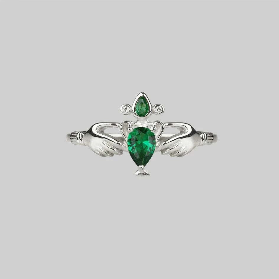 Victorian inspired mourning ring featuring green quartz faceted gemstones set within an ornate Urn between two clutching hands.