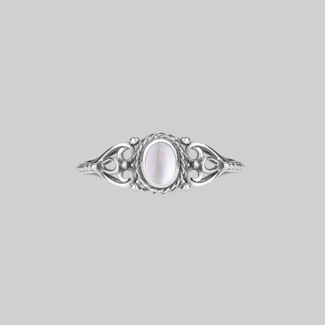 A delicately detailed ring featuring a dreamy Mother of Pearl shell.