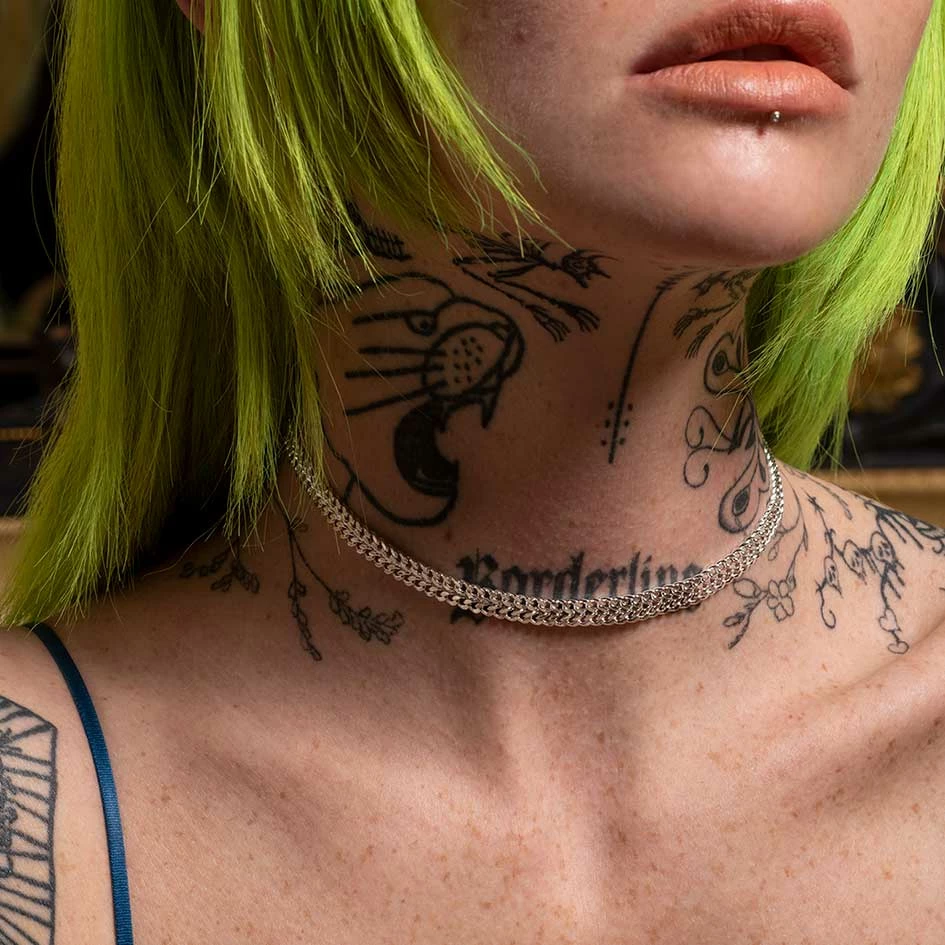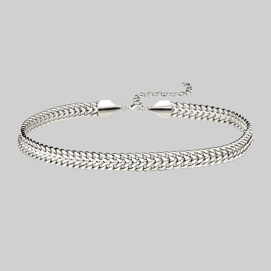 Simple silver wide curb chain choker. Perfect piece to layer with longer chain length styles.