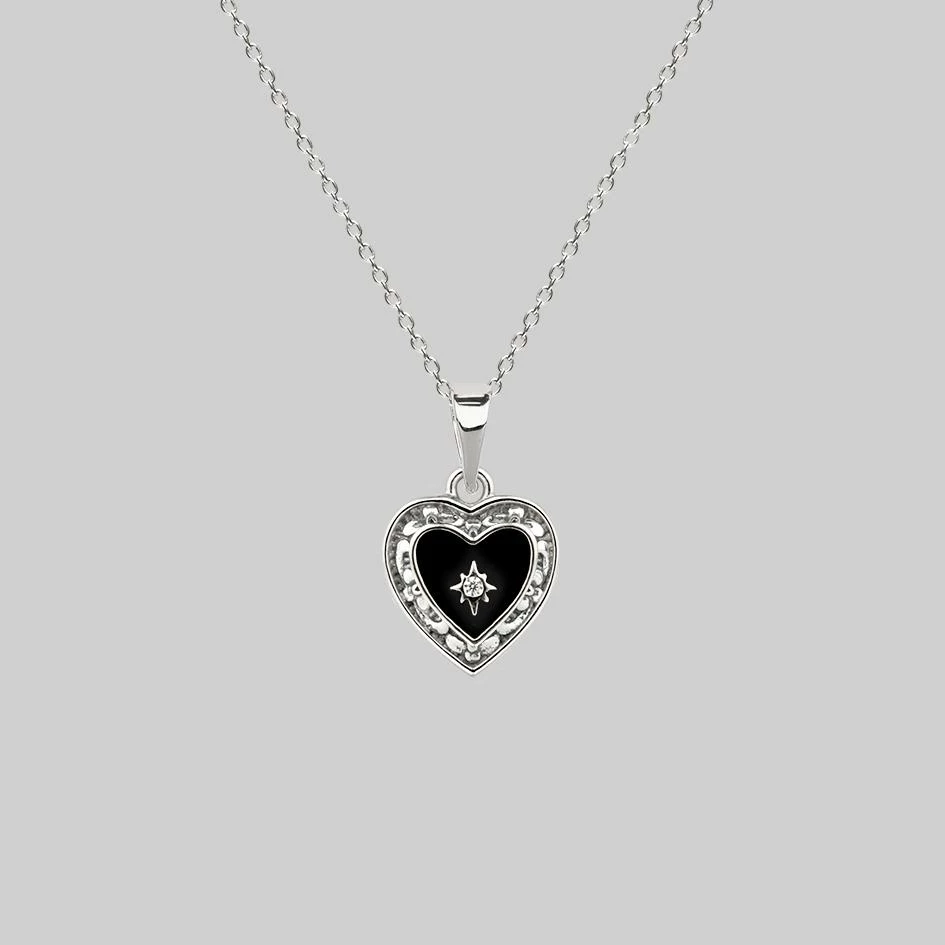 Vintage inspired heart necklace featuring a detailed frame with black enamel centre set with a tiny Cubic Zirconia crystal.
