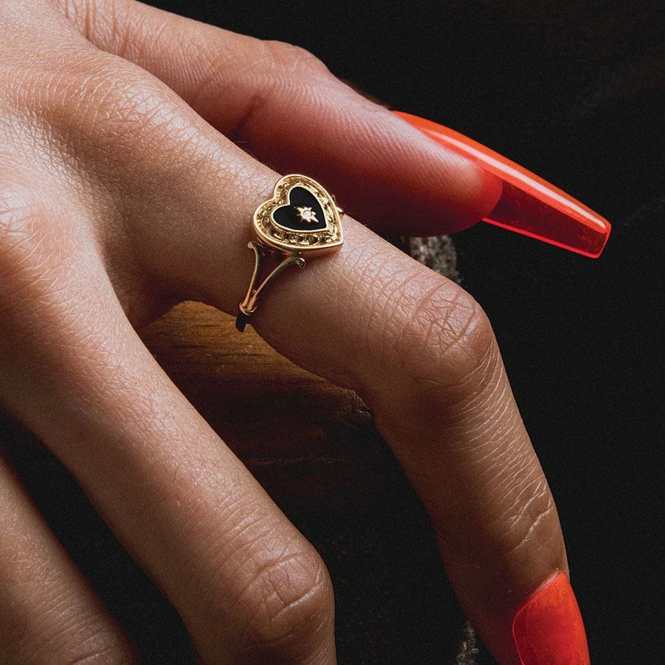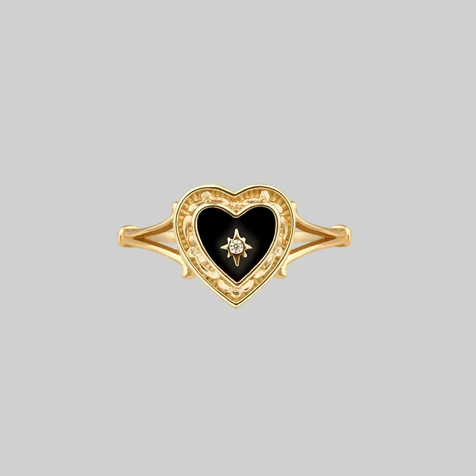 Vintage inspired dark heart ring. Ornate frame filled with black enamel set with a tiny cubic zirconia crystal sits between ornate shoulders.