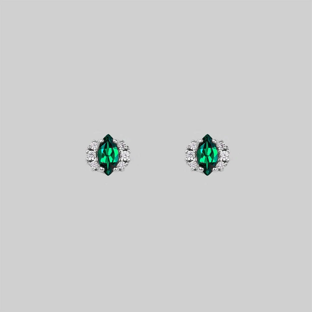 Tiny cluster stud earrings featuring a glowing marquise cut Green Quartz gemstone surrounded by sparkling Cubic Zirconia.