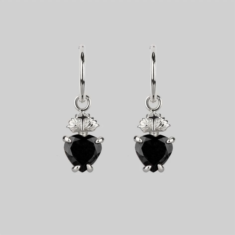 Delicate Sacred Heart hoop earrings featuring dark Black Spinel heart gemstones.