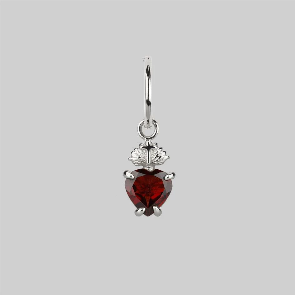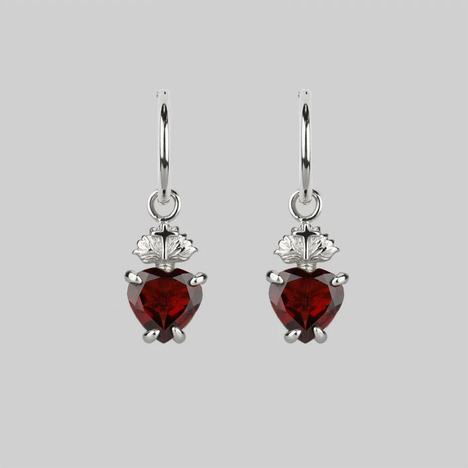 Delicate Sacred Heart hoop earrings featuring deep red Garnet heart gemstones.
