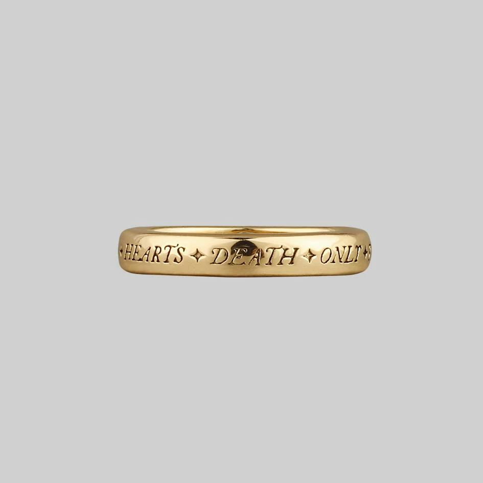 Smooth gold band ring featuring the words United Hearts Death Only Parts inscribed in an old English gothic font. Inside the ring band features a tiny Skull.