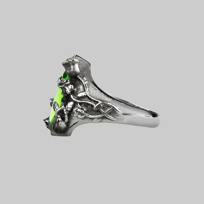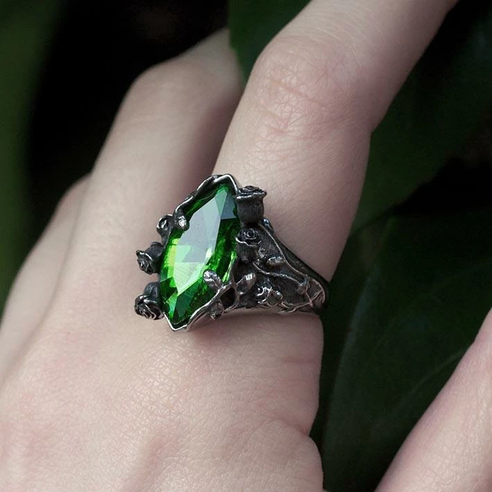 Dark enchanted foliage of rose buds and poison ivy surround a glowing green SWAROVSKI™ crystal. CAUTION: Serious glow.