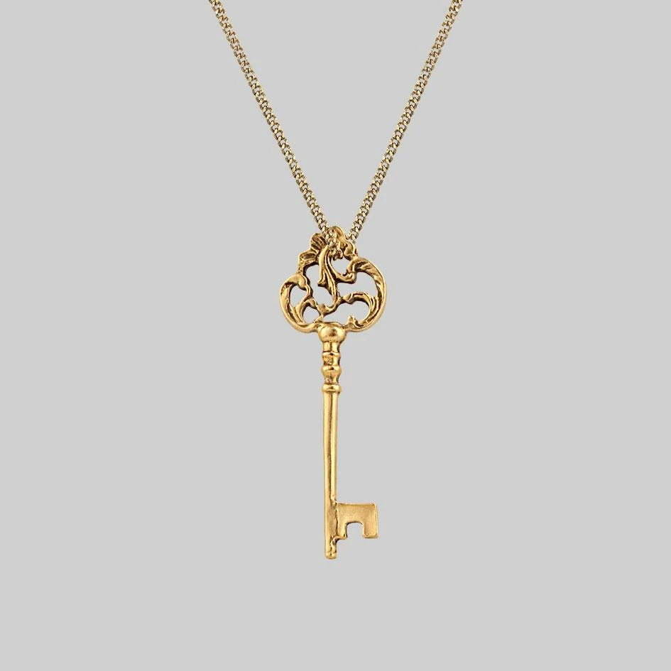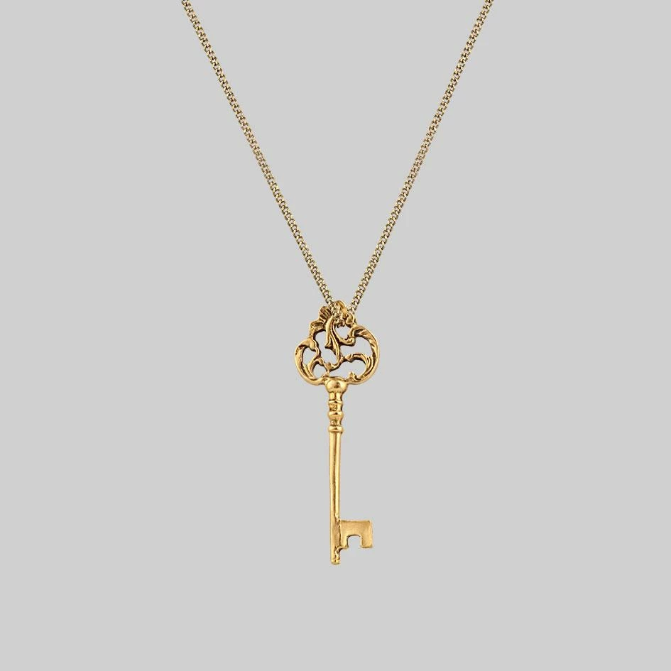 Ornate darkly detailed key hangs on a delicate curb chain.