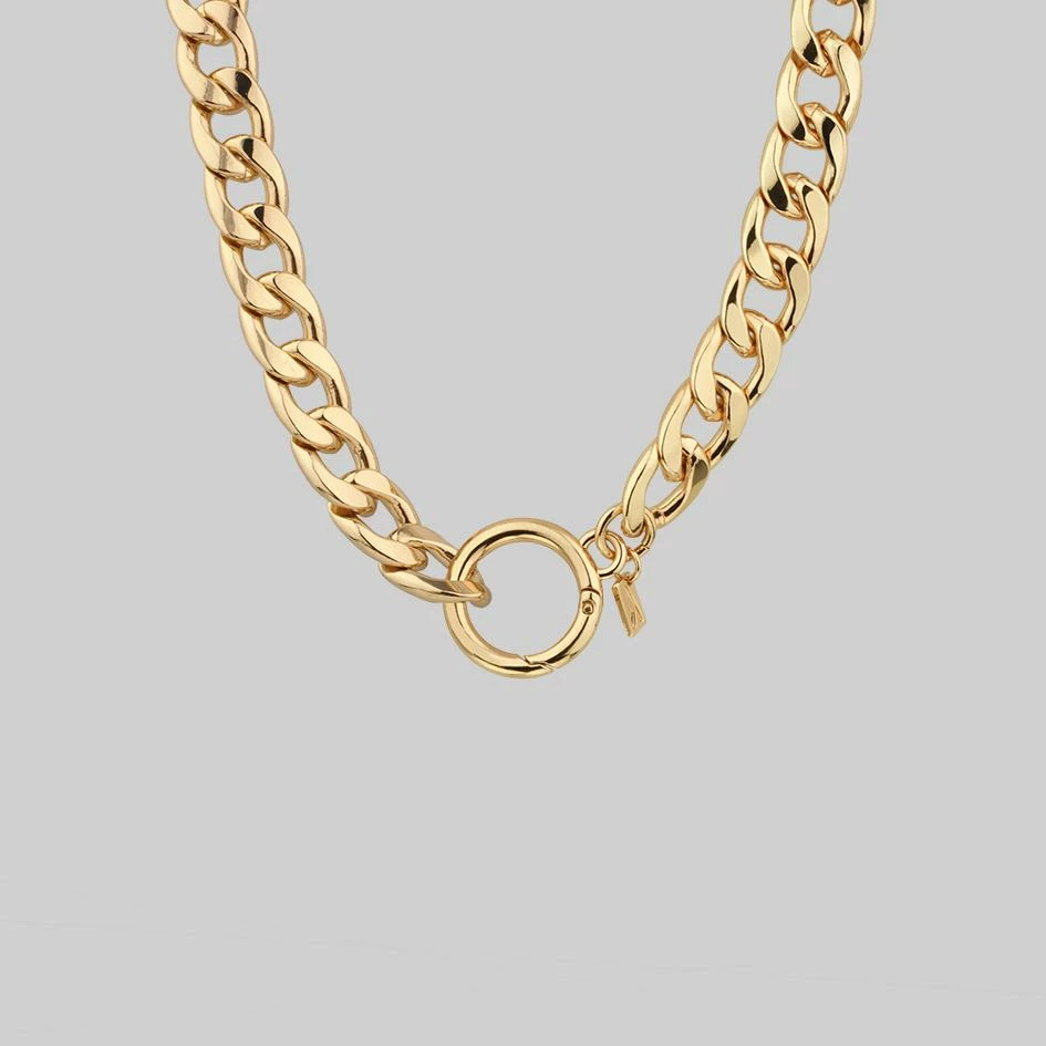 Chunky gold curb chain with circle clasp. This versatile piece can be worn in multiple lengths and even looks great wrapped around your wrist. Wear it solo or add more layers for the ultimate style statement.