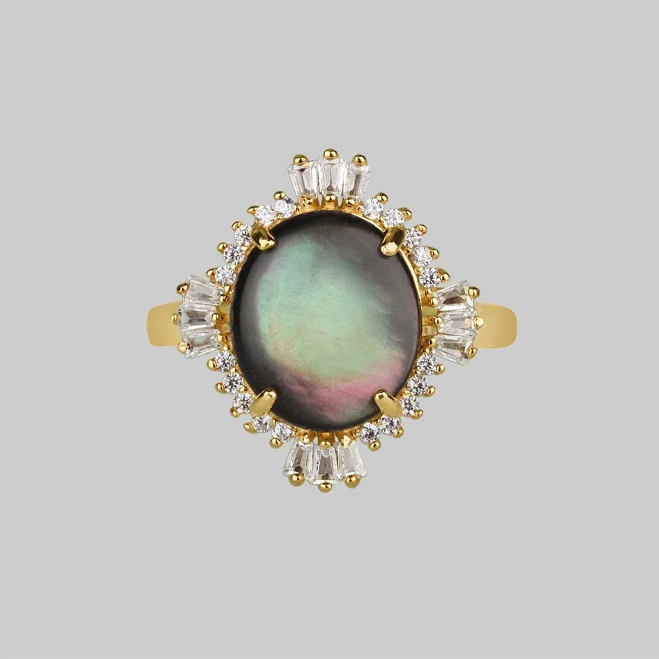 18K Gold plated Sterling Silver, Cubic Zirconia, Black Mother of Pearl. Height 18mm.