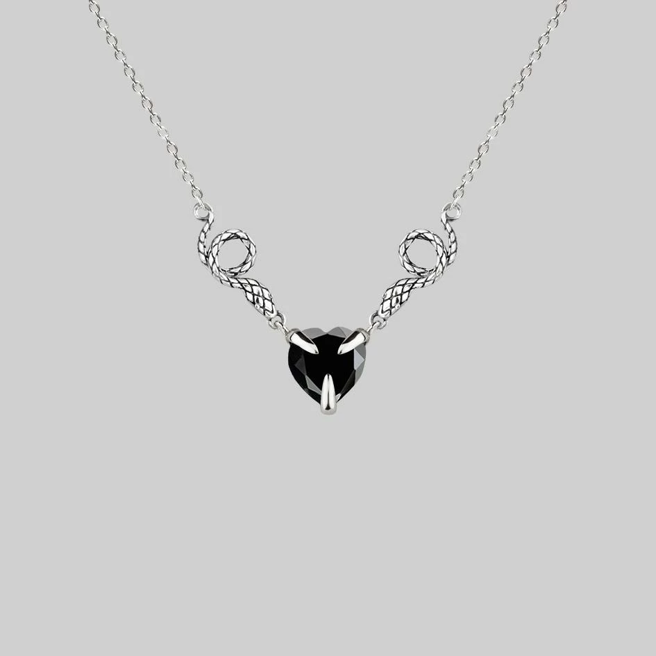 Darkly detailed double snake necklace with a central Black Onyx gemstone heart set within claw shaped prongs. Hangs from a delicate trace chain.