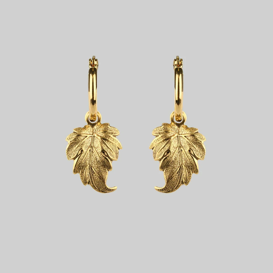Delicate and detailed leaf drop hoop earrings.