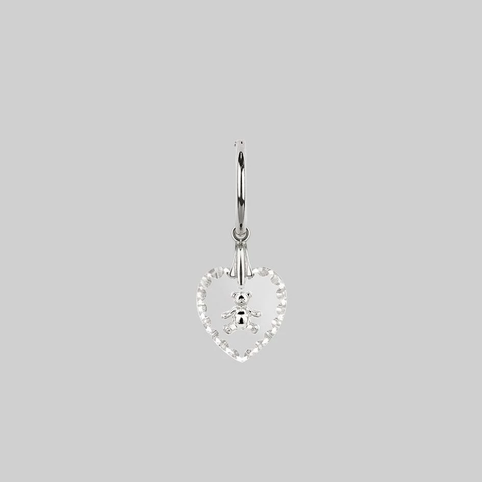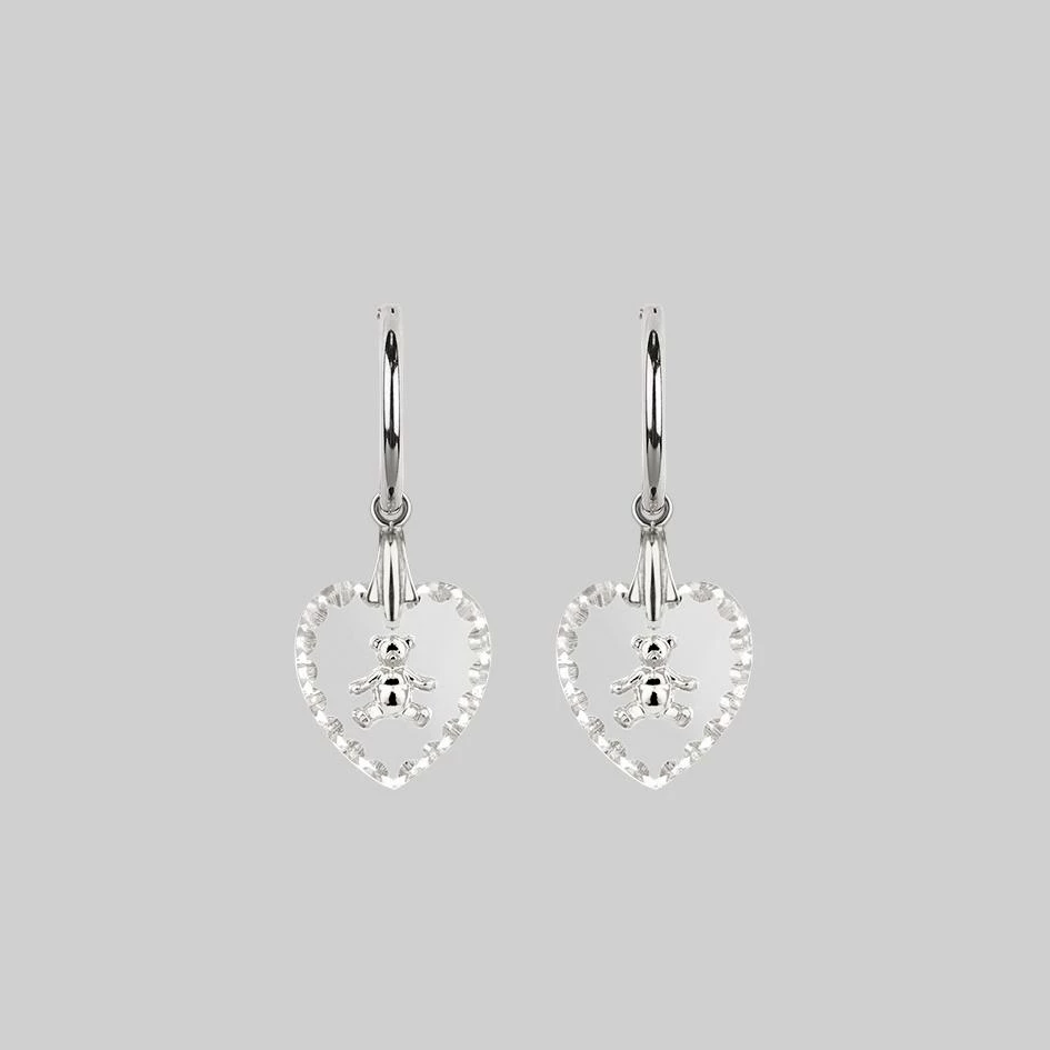 Vintage inspired scalloped edge glass heart Intaglios with adorable intricately engraved teddy bears hang from delicate sleeper hoop earring(s).