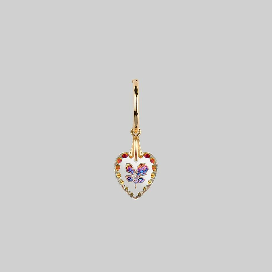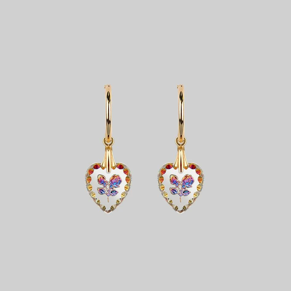 Vintage inspired scalloped edge glass heart Intaglios with intricately engraved iridescent roses hang from delicate sleeper hoop earring(s).Â