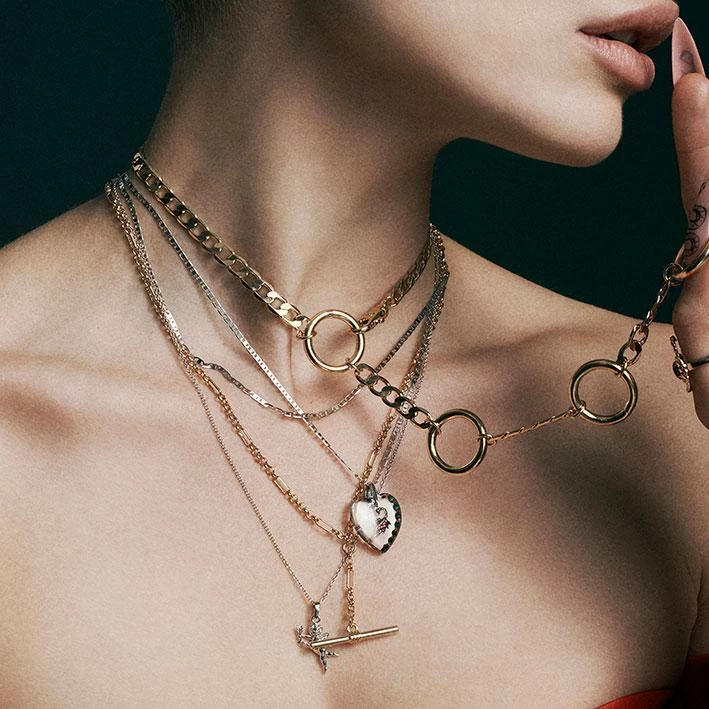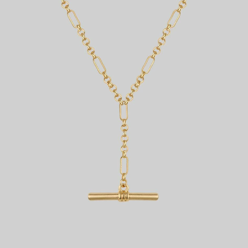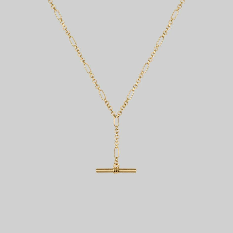The ultimate layering T-Bar necklace featuring fancy Figaro chain with Belcher links.