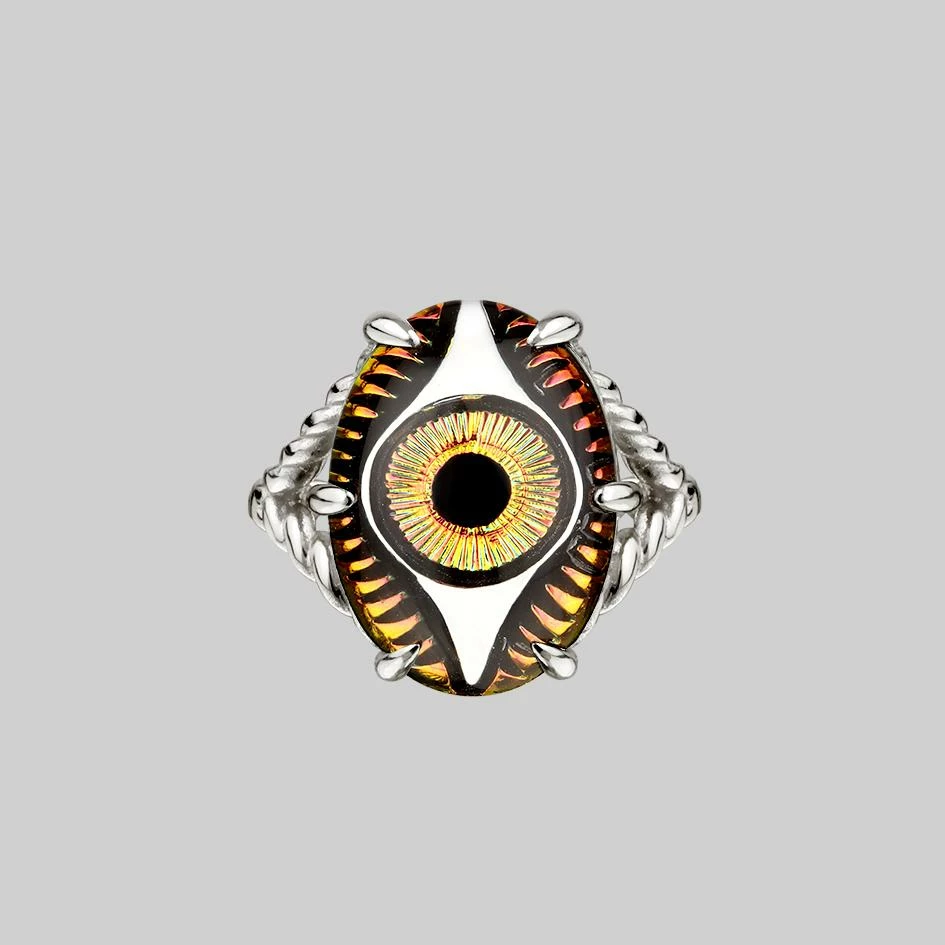 Vibrant iridescent crystal glass eye set within claw shaped prongs sits upon a twisted style ring.