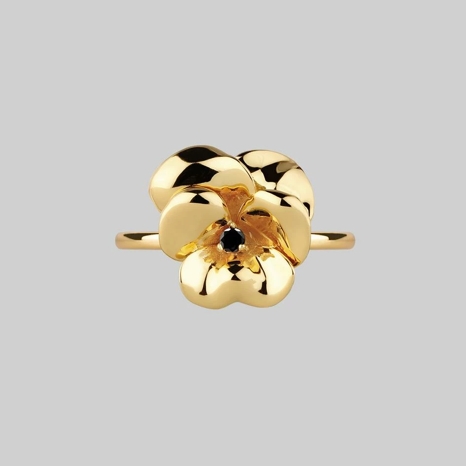 Statement gold band ring featuring a large pansy flower with a Black Spinel gemstone centre.