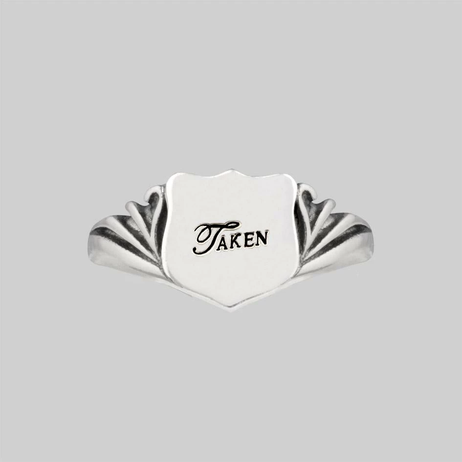 Vintage inspired signet ring with an ornate shield featuring the word Taken in a delicate gothic font.Â