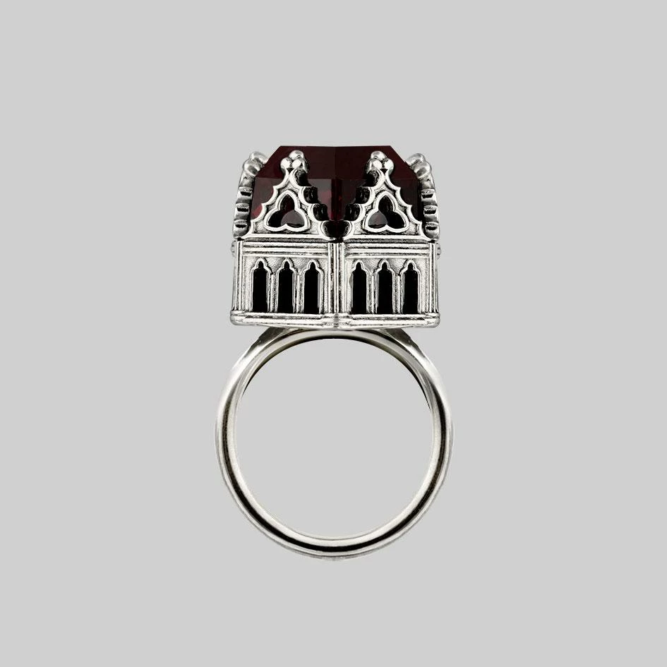 Gothic Cathedral ring featuring a huge Garnet CZ stone set within six temple pinnacles.